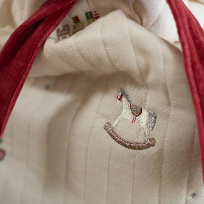 Make Christmas morning extra magical with our Christmas Present Sack – a timeless way to keep special gifts under the tree. Perfect for keeping presents tucked away until the big reveal, these reusable Christmas sacks are a festive tradition little ones will look forward to year after year. Crafted from lightly quilted organic cotton with embroidered details, each sack is finished with a luxurious velvet tie to keep treasures safe. Personalise your Present Sack with your little one’s name or family surname using our embroidery service.