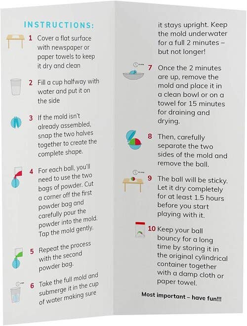 Combine colors, pour the powders into the mold, soak them in water, and walla! A real bouncy ball is born! Mix the bright colors and create incredible patterns.