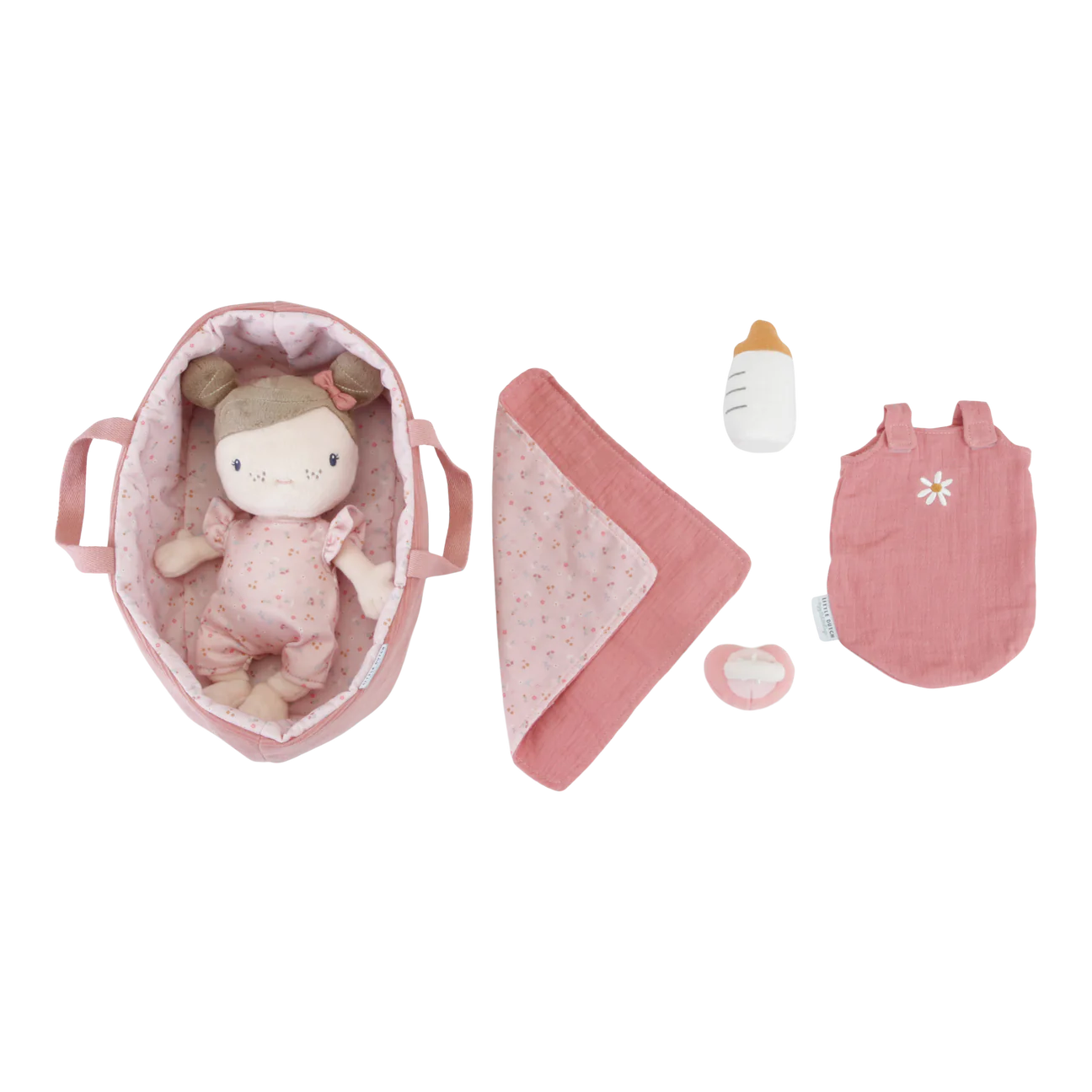 Meet little baby Rosa. This sweet Little Dutch plush doll wants to be cuddled and carried around. Baby Rosa will become friends with every little girl or boy. They can feed her with the bottle or calm her down with the dummy. They can change her nappy, put on a cap, and tuck her in with a blanket. Baby Rosa also enjoys going on a trip in her cute travel basket. By looking after Rosa, children learn to take up a caring role in a playful way. They can tell baby Rosa all their secrets. She wont tell anyone. She is wonderfully soft to nestle up against, which gives children a feeling of safety.