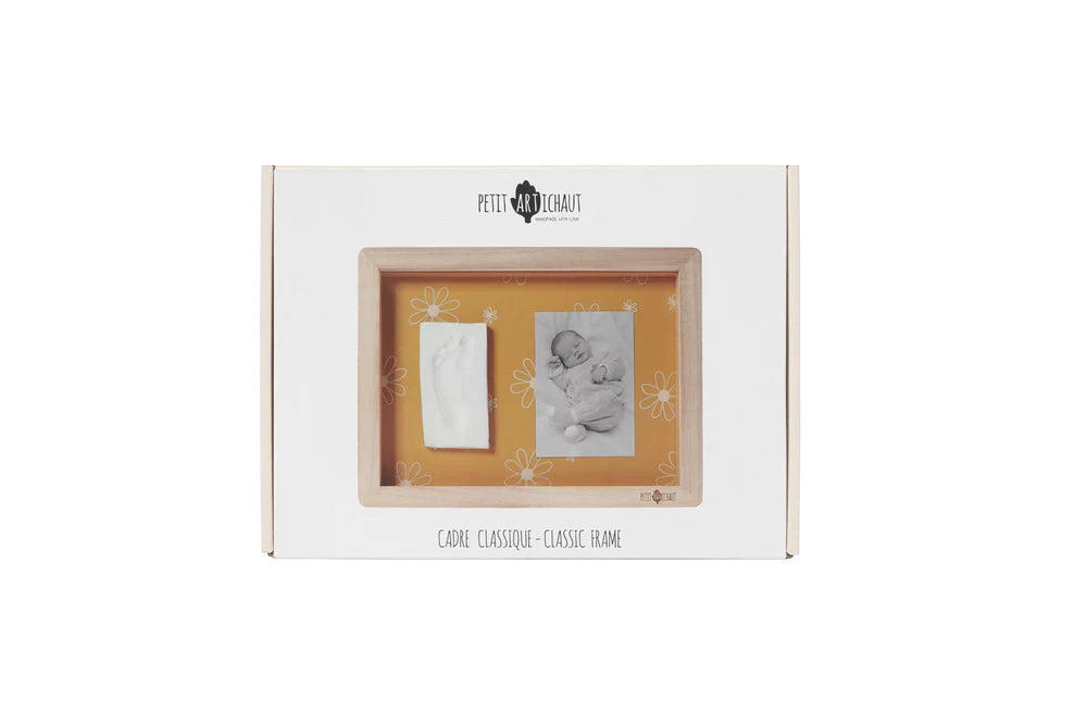 The Classic Frame - Daisy Ochre is designed to showcase both a photograph and a baby imprint. This traditional wall-hanging frame has a customizable reversible ochre background with or without floral pattern. Included in the kit are hypoallergenic clay, a roller, and instructions to easily create your print.