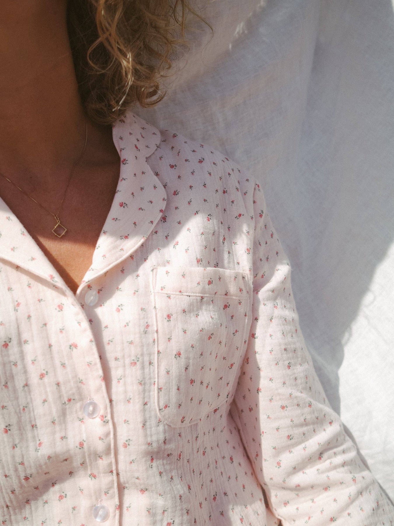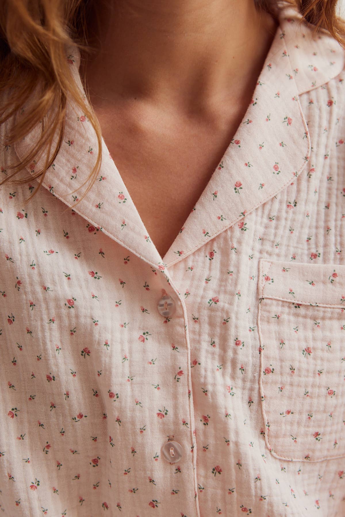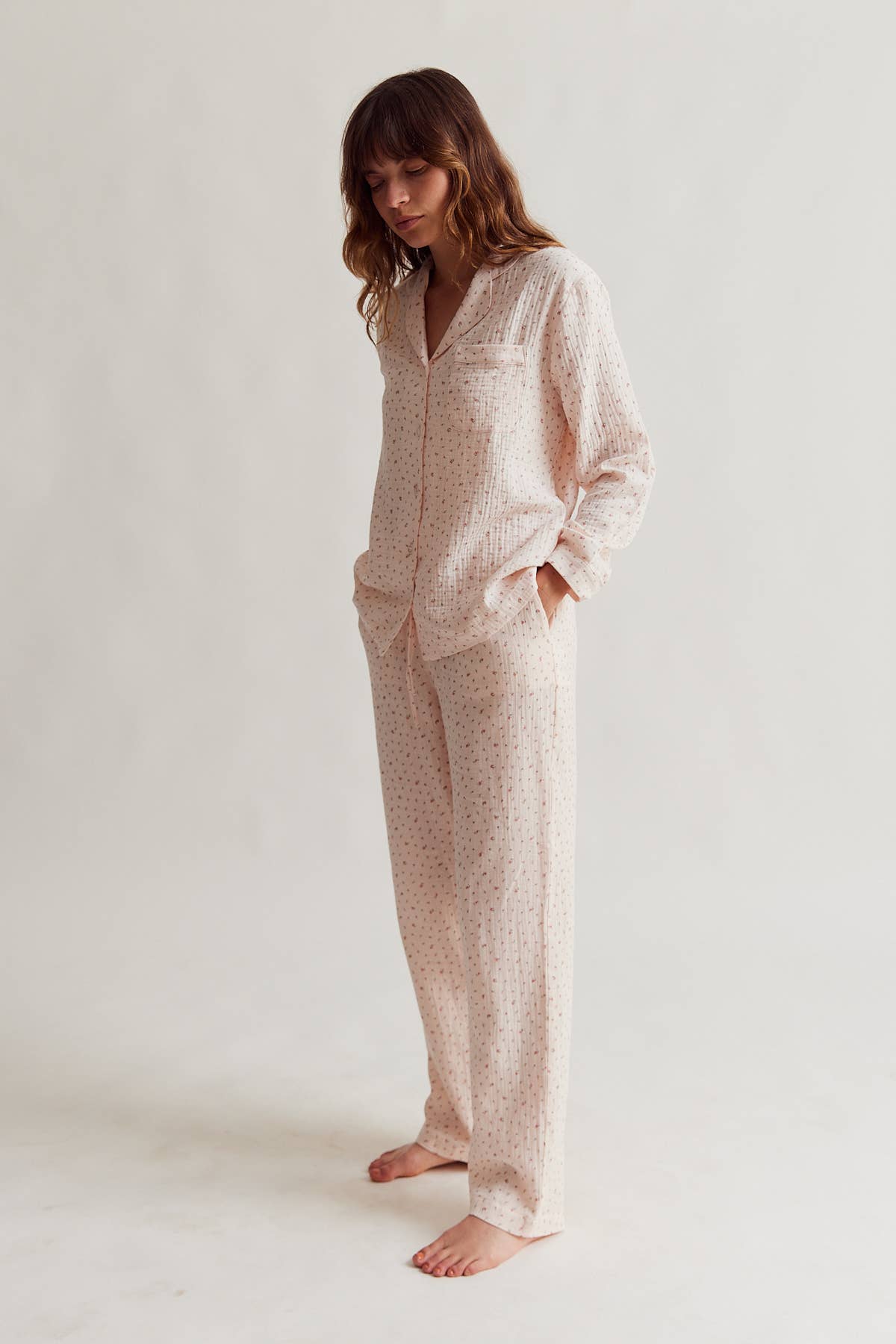 A classic pyjama in a tiny pink rose bud print on blush cotton muslin. Traditional button through shirt with a straight trouser featuring a tie-front elasticated waistband, can be worn high on the waist or low on the hips.