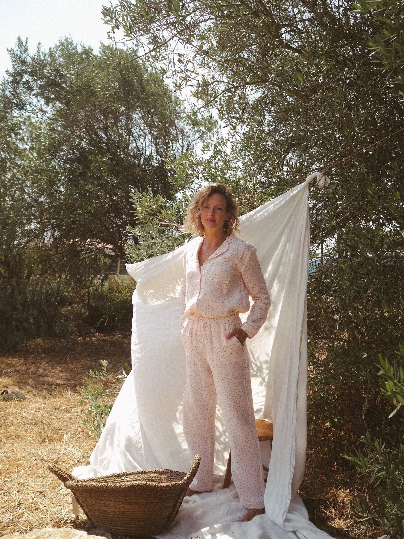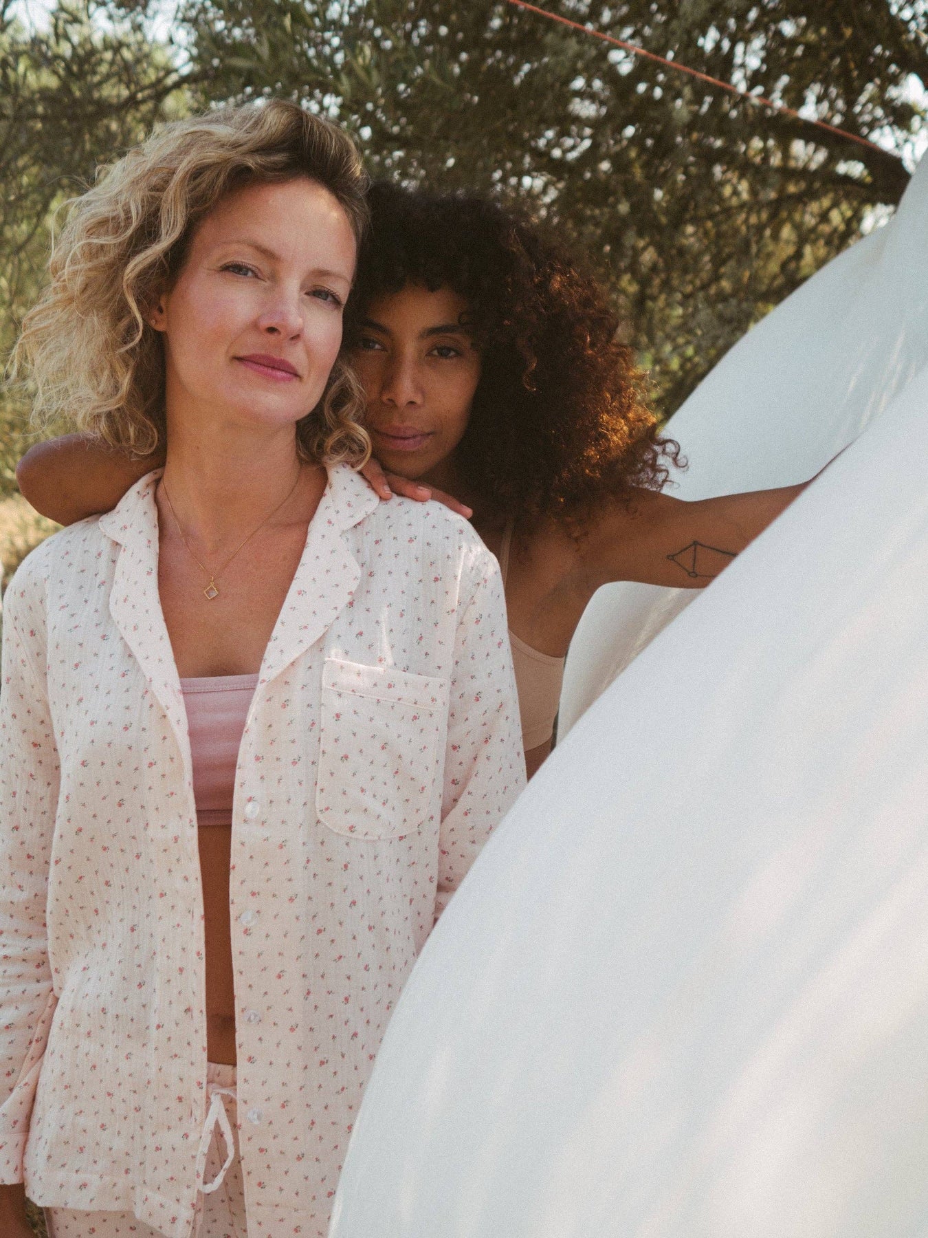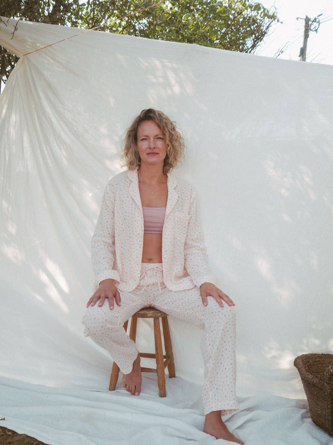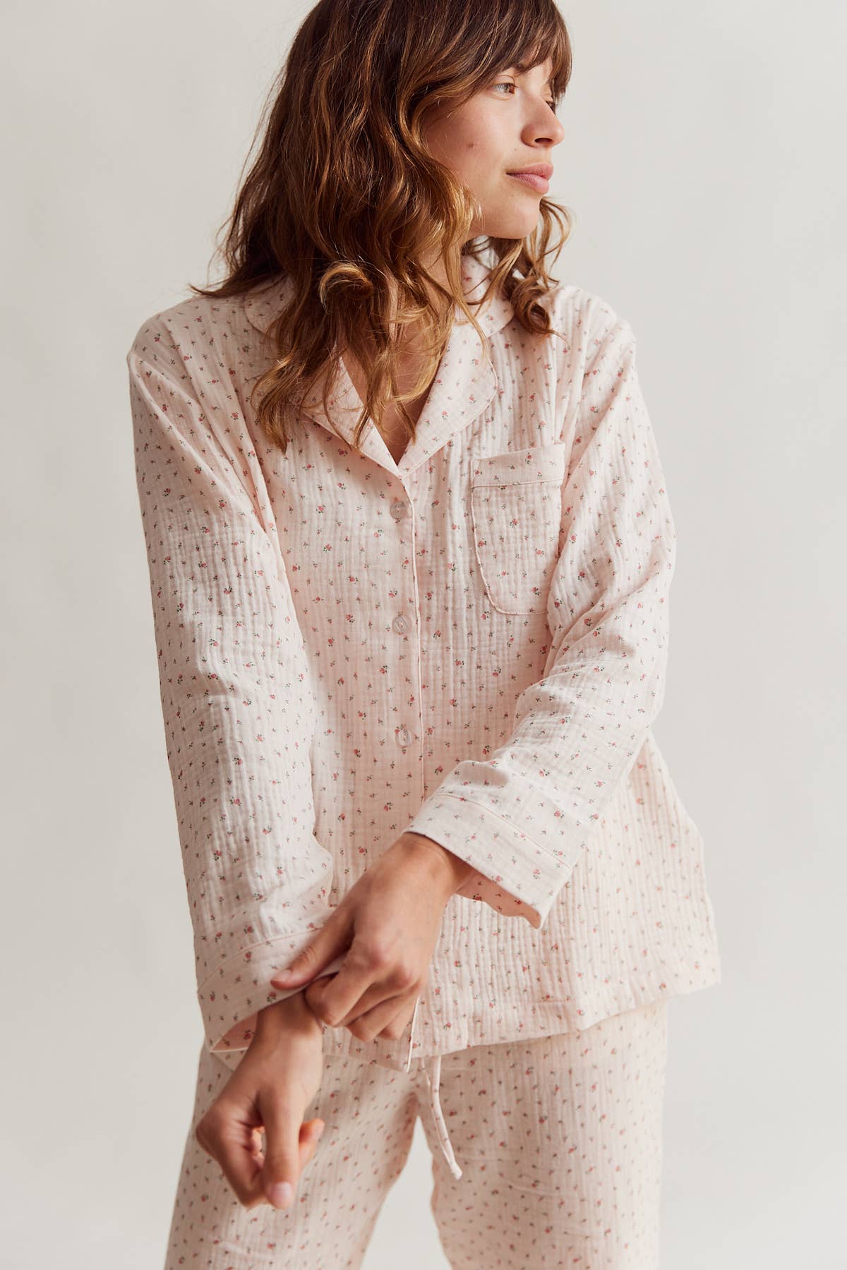 A classic pyjama in a tiny pink rose bud print on blush cotton muslin. Traditional button through shirt with a straight trouser featuring a tie-front elasticated waistband, can be worn high on the waist or low on the hips.
